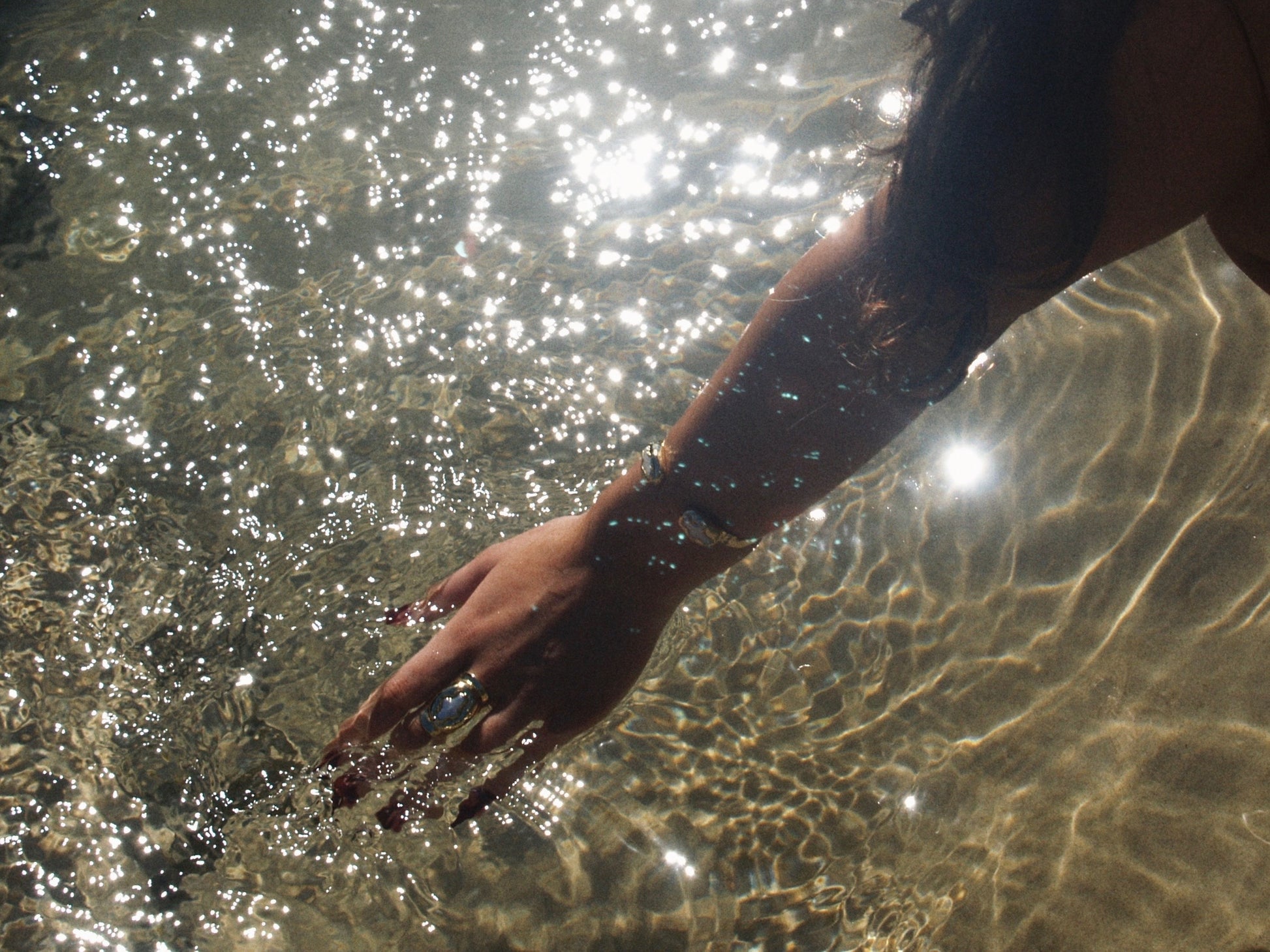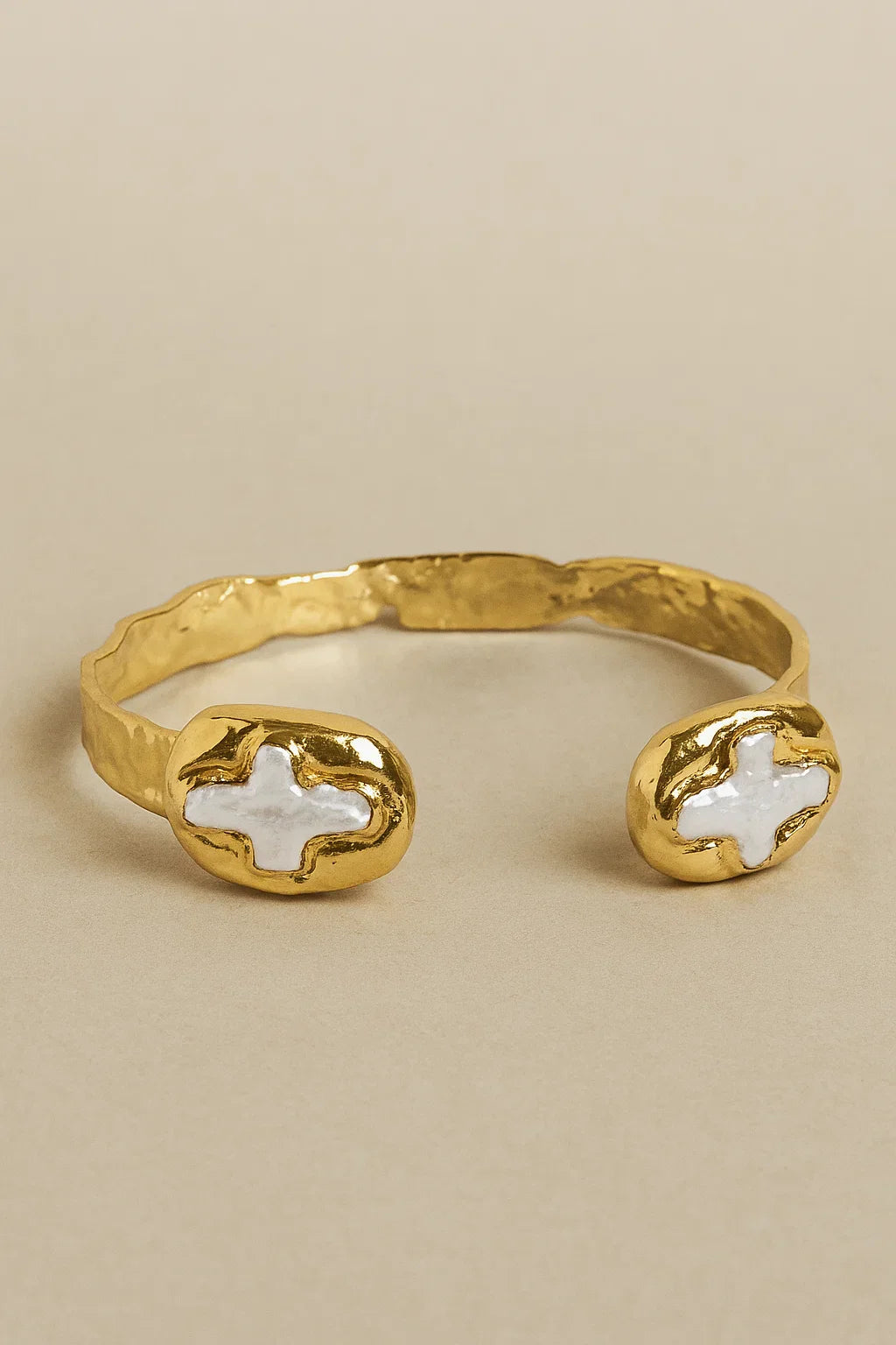 A stunning bracelet that is perfect on its own or to complement other jewels. Made with 18k gold electroplating and a freshwater pearl centrepiece, every bracelet is unique. Laid back summer sophistication.