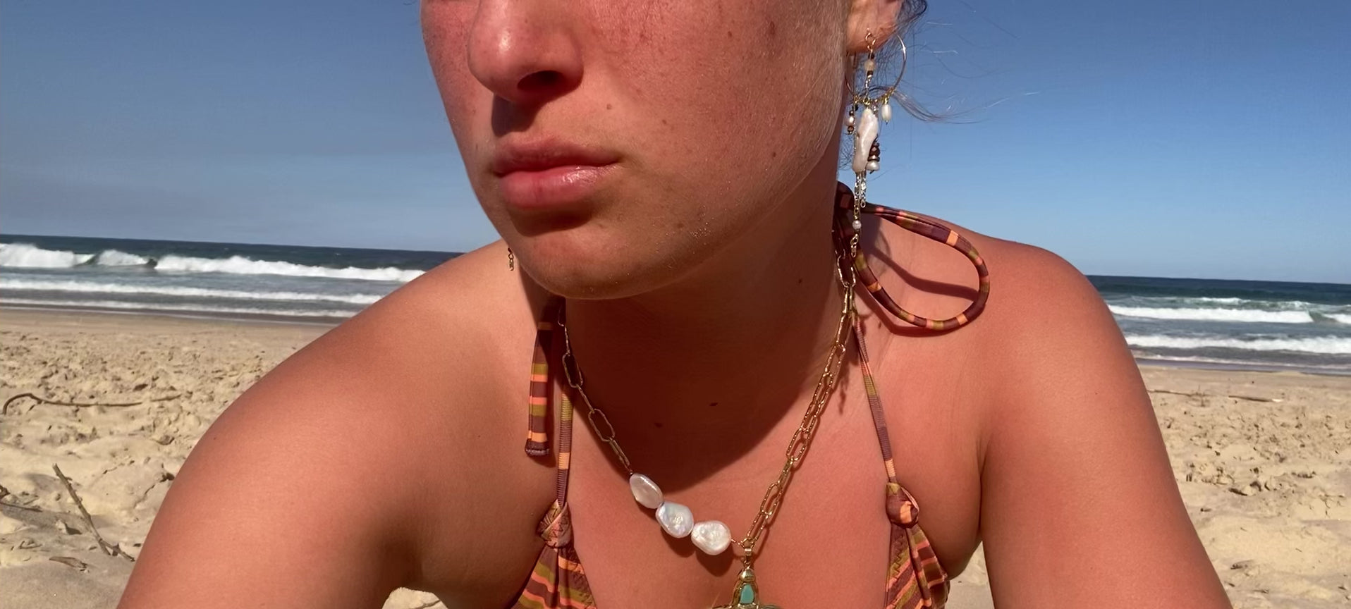 Made to be worn together our chocolate beaded hoops and threads are an elegant beachy pair. Tied together through natural pearls, tiger eye stone and unique gold chain, get them together to save!
